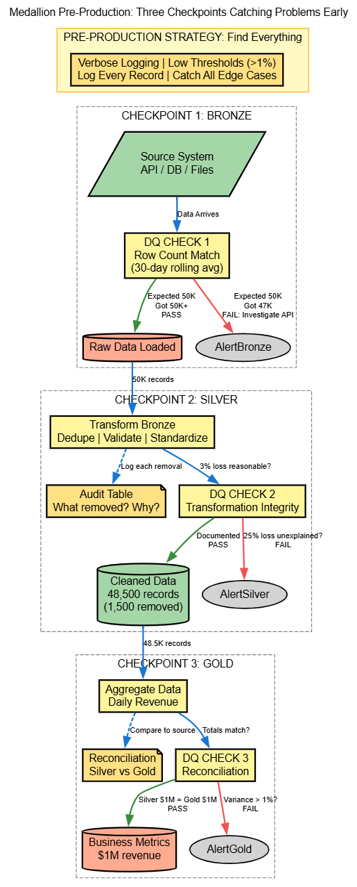 What it validates: Aggregations in Gold reconcile to Silver. If Silver shows $1M but Gold shows $950K, something's broken.