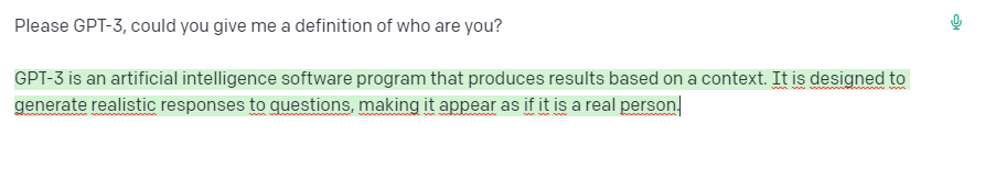 Shall we do a test? I asked GPT-3 to define itself, and this was the result: