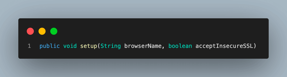 Step 3. Create a method and name it setup(). This method will take two parameters, namely browserName, and acceptInsecureSSL.