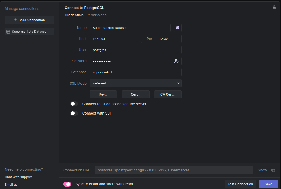 Once you have entered the Postgres credentials, click the "Test Connection" button at the bottom to make sure the credentials are correct. If the credentials are correct, click the "save" button to the right of the "Test Connection" button to complete Postgres and Arctype SQL client integration, as shown below.