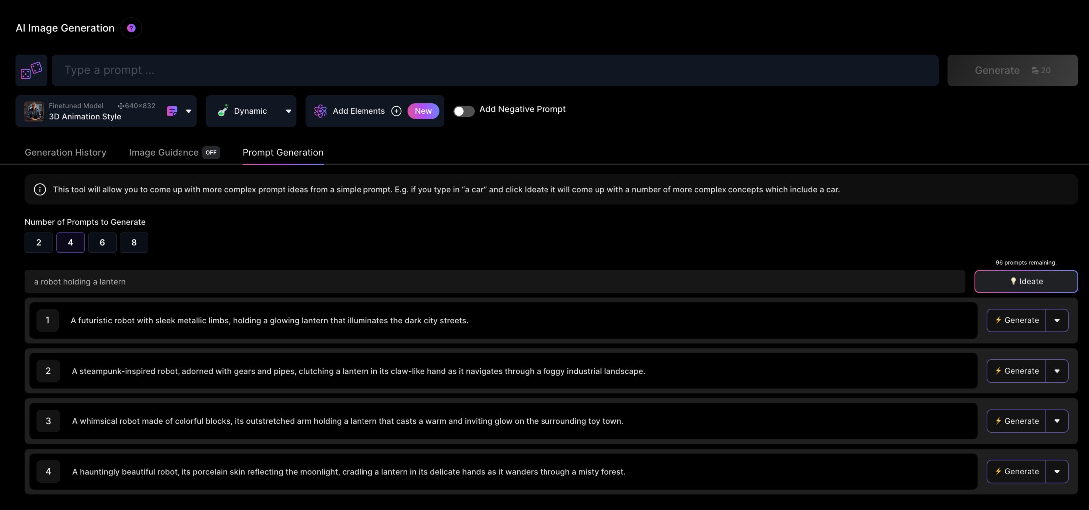 We are now in the image generation screen of Leonardo. We are going to make use of another feature of Leonardo, the generation of prompts for our ideas. To do this, let’s go to the third tab called Prompt Generation, and type in a brief idea about what we want to generate. We will receive up to four prompts about what we have entered and we can select any of them to generate our image by clicking Generate, or if we prefer, we can edit any of the prompts before generating the image.
