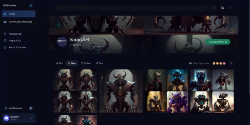This is our profile, and these are all the images that we have generated with our users through Discord. On the left, we will see a few options since our user has a free version. If we click on Community Showcase, we will see some of the images that other users have taken so far.
