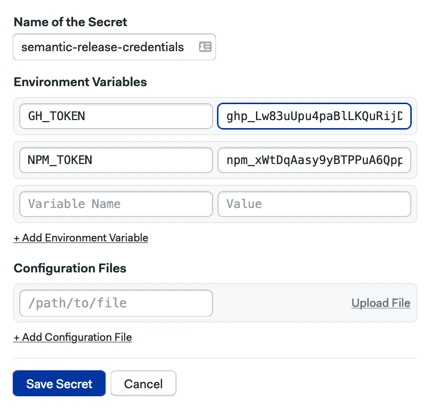 semantic-release-credentials. Add your GitHub and/or NPM tokens as shown:![]()