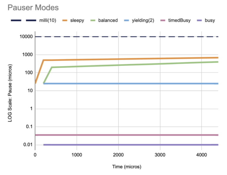 The Busy, TimedBusy, Yielding, and Millis Pausers show flat response times regardless of how long the thread waits to receive an event, but with varying response times due to the different yielding strategies vs CPU usage. In many cases, TimedBusy in particular provides an excellent compromise between low latency and CPU usage.